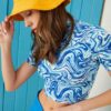 Kadın Beyaz Mavi Ebru Desenli Kısa Kol Crop