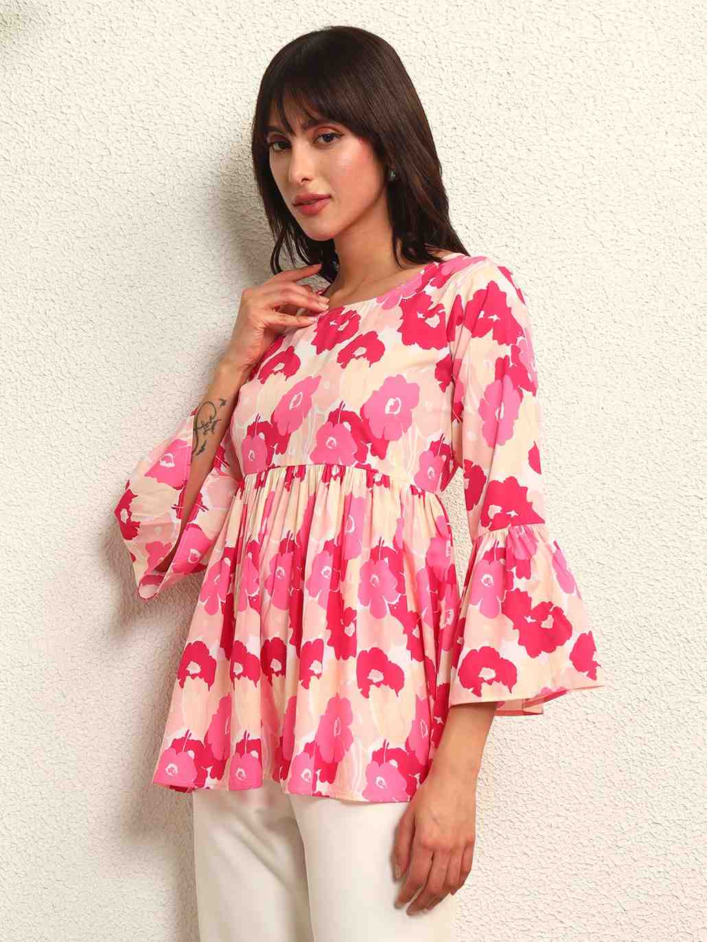 Women Floral Printed Bell Sleeve Peplum Top.